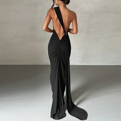 El vestido sexy liso para mujer con espalda al aire es una prenda diseñada para destacar la silueta con un estilo atrevido, elegante y moderno. Su diseño fruncido realza las curvas de forma favorecedora, mientras que la abertura alta añade movimiento y un toque sensual que eleva cualquier look de noche.